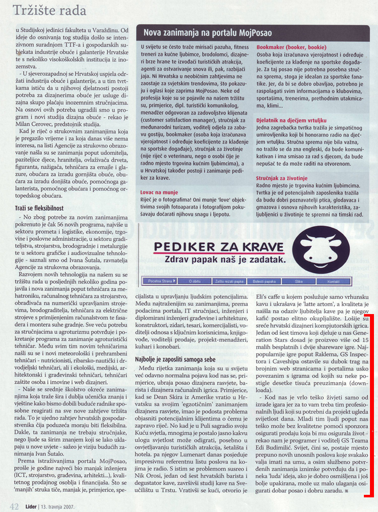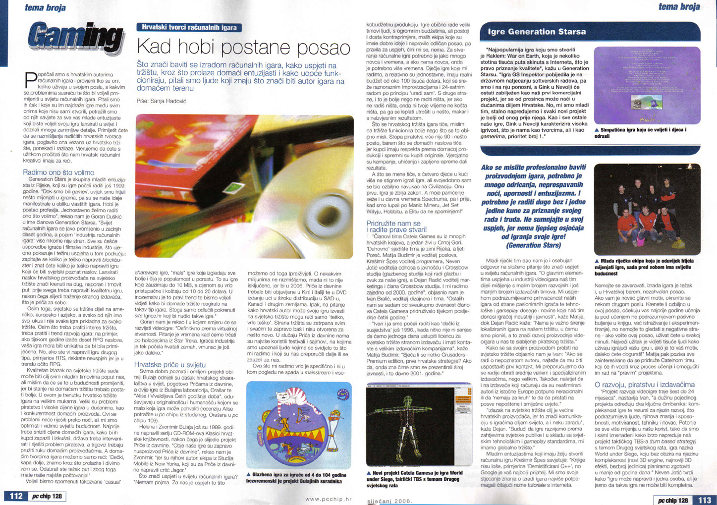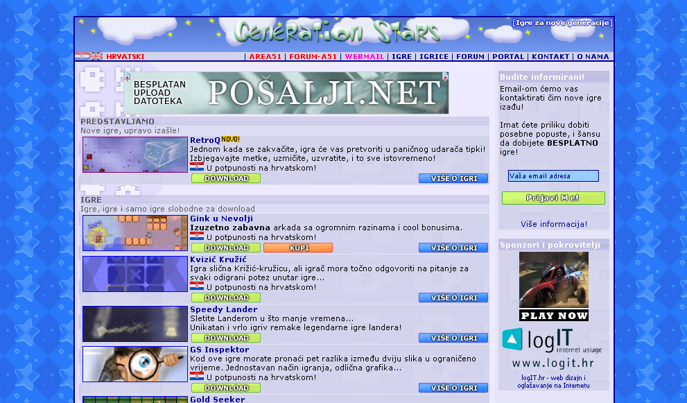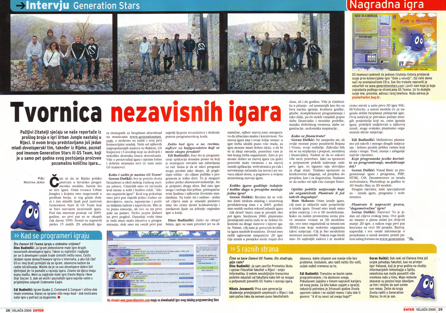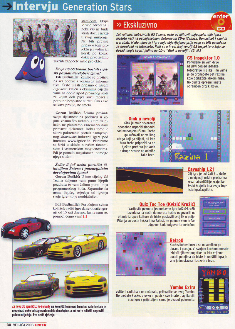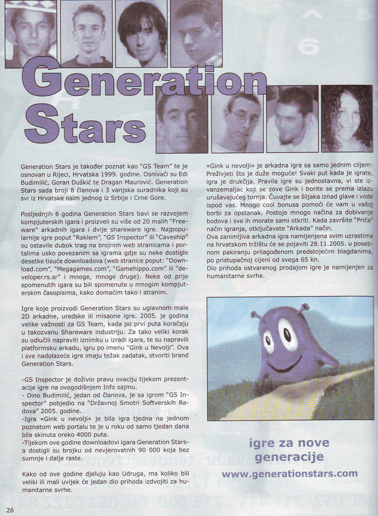 For the past years Generation Stars has been developing games and made over 15 small arcade and puzzle freeware games, including two shareware games. Most popular like "Raklem", "GS Inspector" and "Caveship" made their mark on numerous web sites and game portals. Some of those games reached tens of thousands of downloads. Our team and our games have been mentioned in all domestic and some foreign computer magazines plus a mark made in many domestic newspapers which are "Novi List", "Nedjeljnji Vjesnik", "Jutarnji List" and "Vecernji List". When it comes to magazines, it were: "Hacker", "PC Play", "PC Chip", "Bug" and "Enter". Dino Budimilic, one of our associates, won on "State Championship in Software" in the year 2005 with a game "GS Inspector".