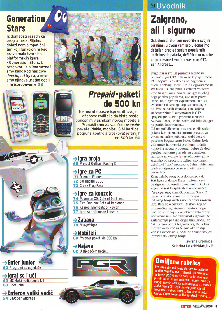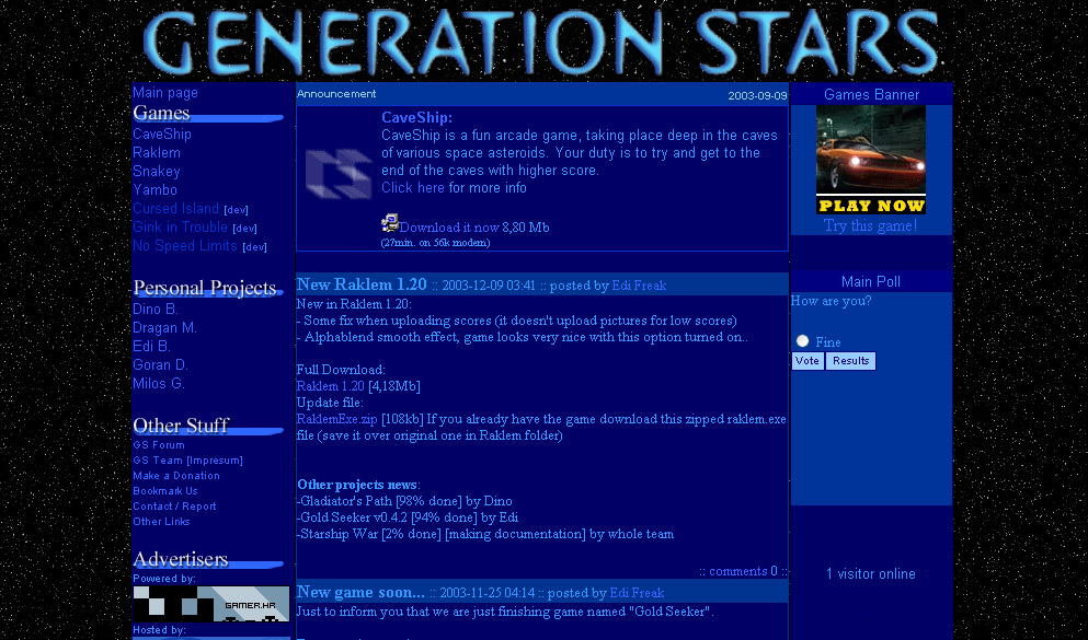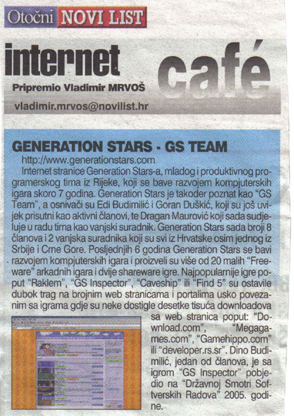 For the past years Generation Stars has been developing games and made over 15 small arcade and puzzle freeware games, including two shareware games. Most popular like "Raklem", "GS Inspector" and "Caveship" made their mark on numerous web sites and game portals. Some of those games reached tens of thousands of downloads. Our team and our games have been mentioned in all domestic and some foreign computer magazines plus a mark made in many domestic newspapers which are "Novi List", "Nedjeljnji Vjesnik", "Jutarnji List" and "Vecernji List". When it comes to magazines, it were: "Hacker", "PC Play", "PC Chip", "Bug" and "Enter". Dino Budimilic, one of our associates, won on "State Championship in Software" in the year 2005 with a game "GS Inspector".
